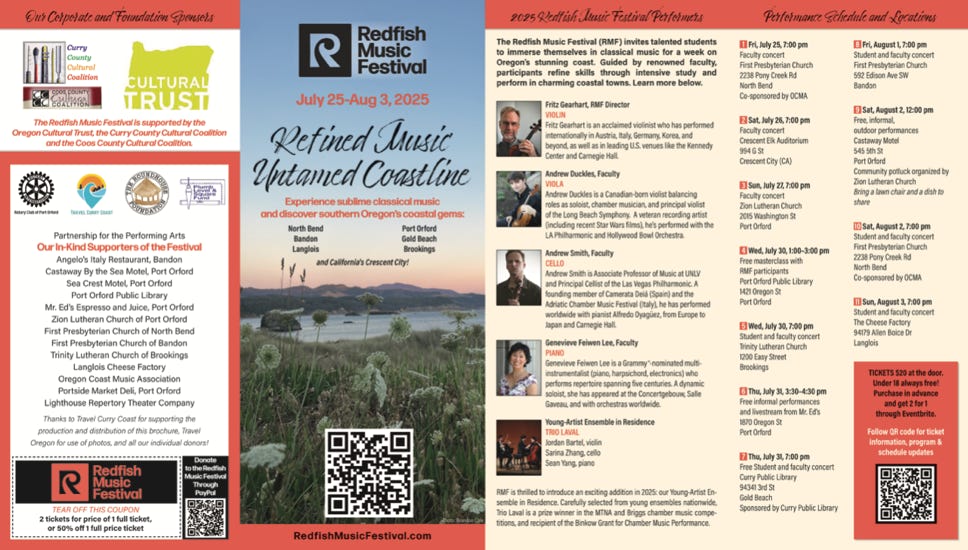 The Redfish Music Festival operates in the south coast region of Oregon and is named after the Redfish Rocks Marine Reserve located off-shore next to the small coastal town of Port Orford, Oregon. RMF consists of three parts — a summer festival that features live classical music in public concerts along with our Young Artist Fellowship Program. We also offer a winter season which consists of tours by our faculty musicians performing in the fall and spring in our area of operation. The third arm of our operations is community education outreach where we take classical music into area schools to inspire school age students and introduce them to classical music.