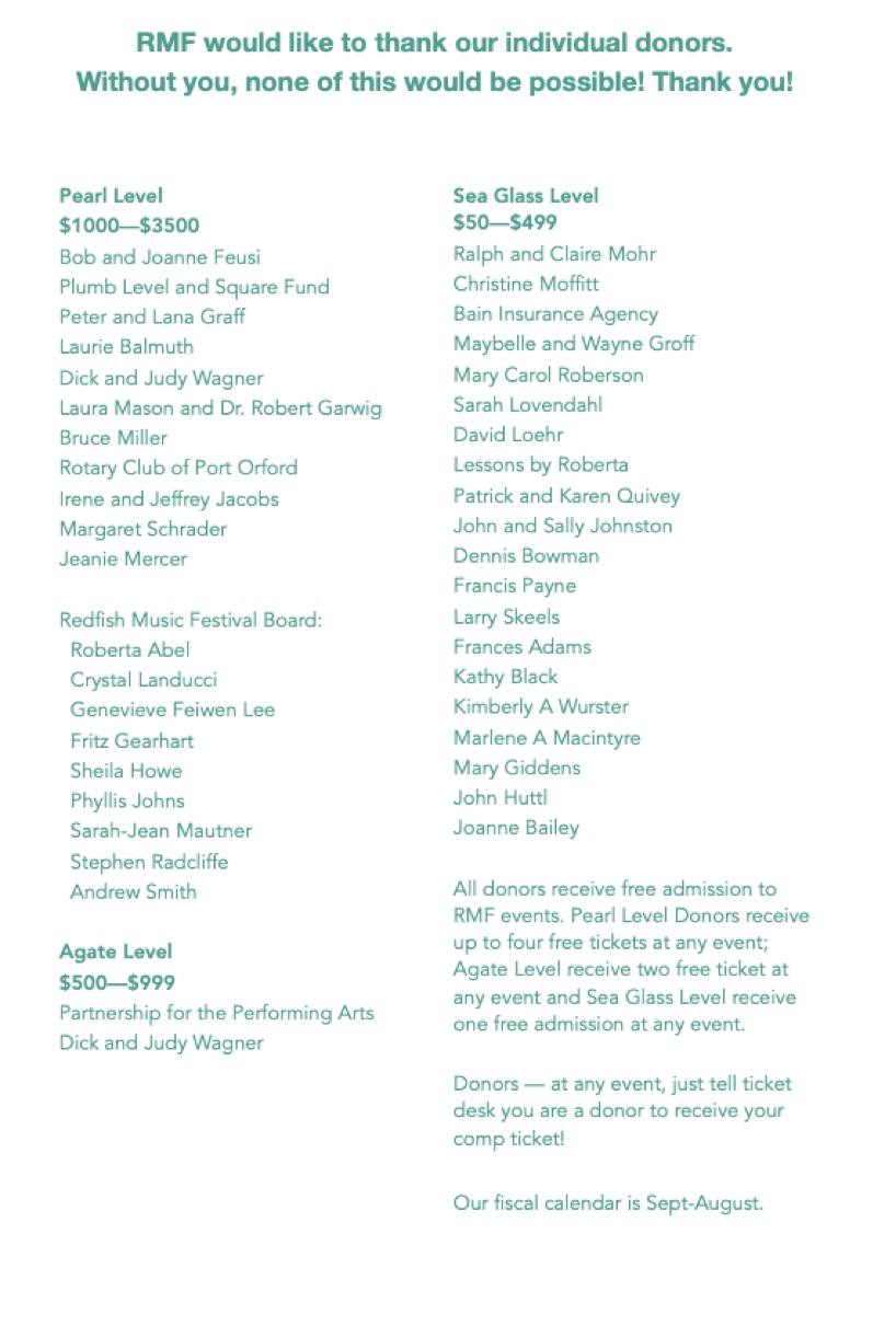 We appreciate any amount you choose to give – all donations (minus credit card fees) go directly to help Redfish’s operating costs. All donors receive free admission to RMF events. Pearl Level Donors ($1000-$2500) receive up to four free tickets at any event; Agate Level ($500-$999) receive two free ticket at any event and Sea Glass Level ($50-$499) receive one free admission at any event.